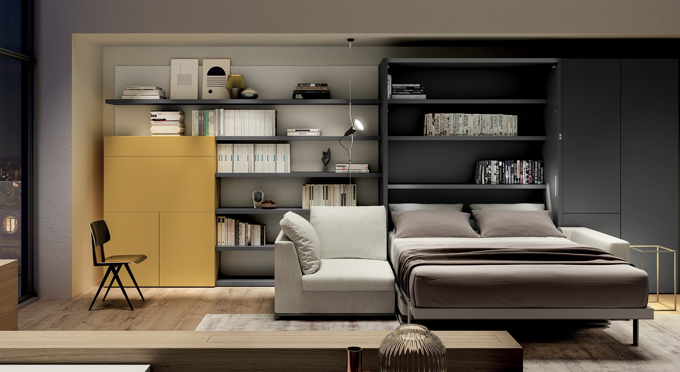 Sleeping and entertaining: This category includes murphy beds with sofas in which you can receive your guests during the day on the very comfortable sofa and spend pleasant nights by transforming it into a real bed once night falls. You can also add other elements to your composition such as a library, a dressing room, a living room, etc.