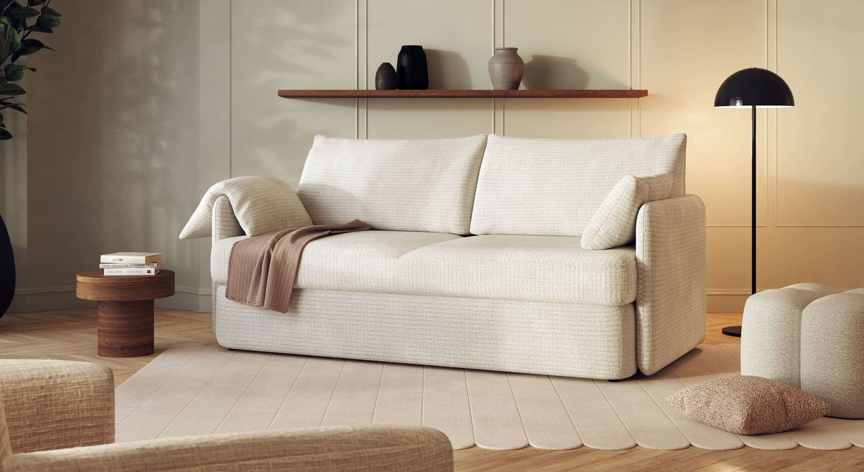Priorité au confort avec son matelas de 18cm ! Petit, confort et séduisant avec ses accoudoirs rétro moderne, le canapé-lit ARLO et ses coussins déco vous assureront des soirées moelleuses.