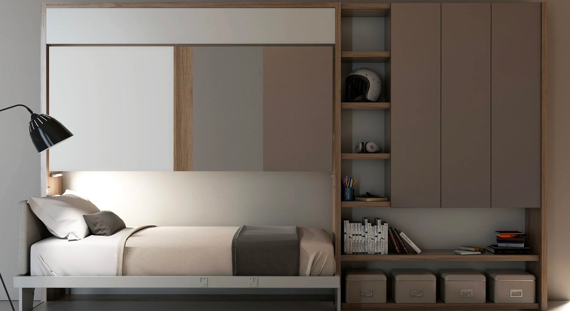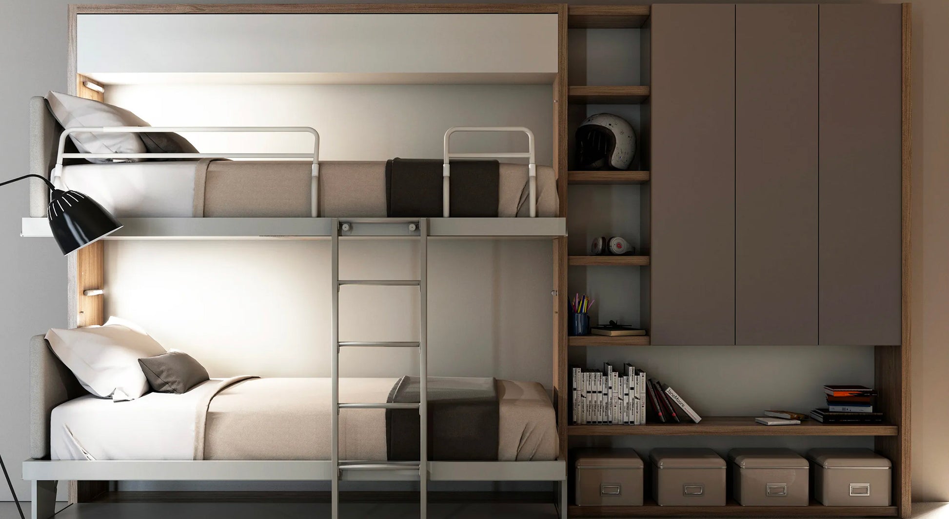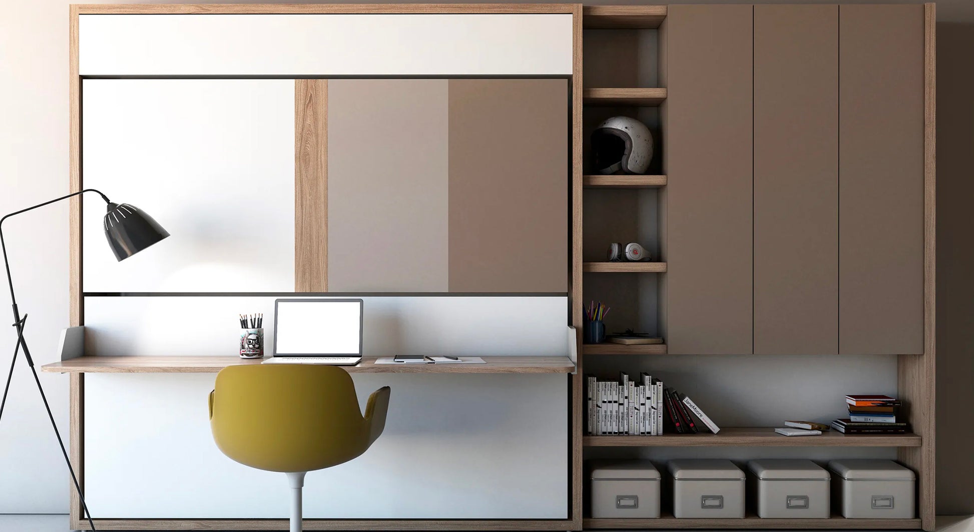 Featuring a contemporary design, the Kali Duo Board model includes a desk, a double bed frame, a mechanism, a ladder, and fall protection barriers (on the top layer) to ensure a flawless, everyday sleeping experience! The Kali Duo Board wall bed from Bimodal is available in a wide range of colors and will meet your every need. This Clei wall bed model is guaranteed for 10 years by Bimodal, the wall bed specialist. " The less space you give us, the more we will create for you." The brand Clei is known worldwide for the ingenuity, innovation, patents and quality of its products that are capable of multiplying the value of space.