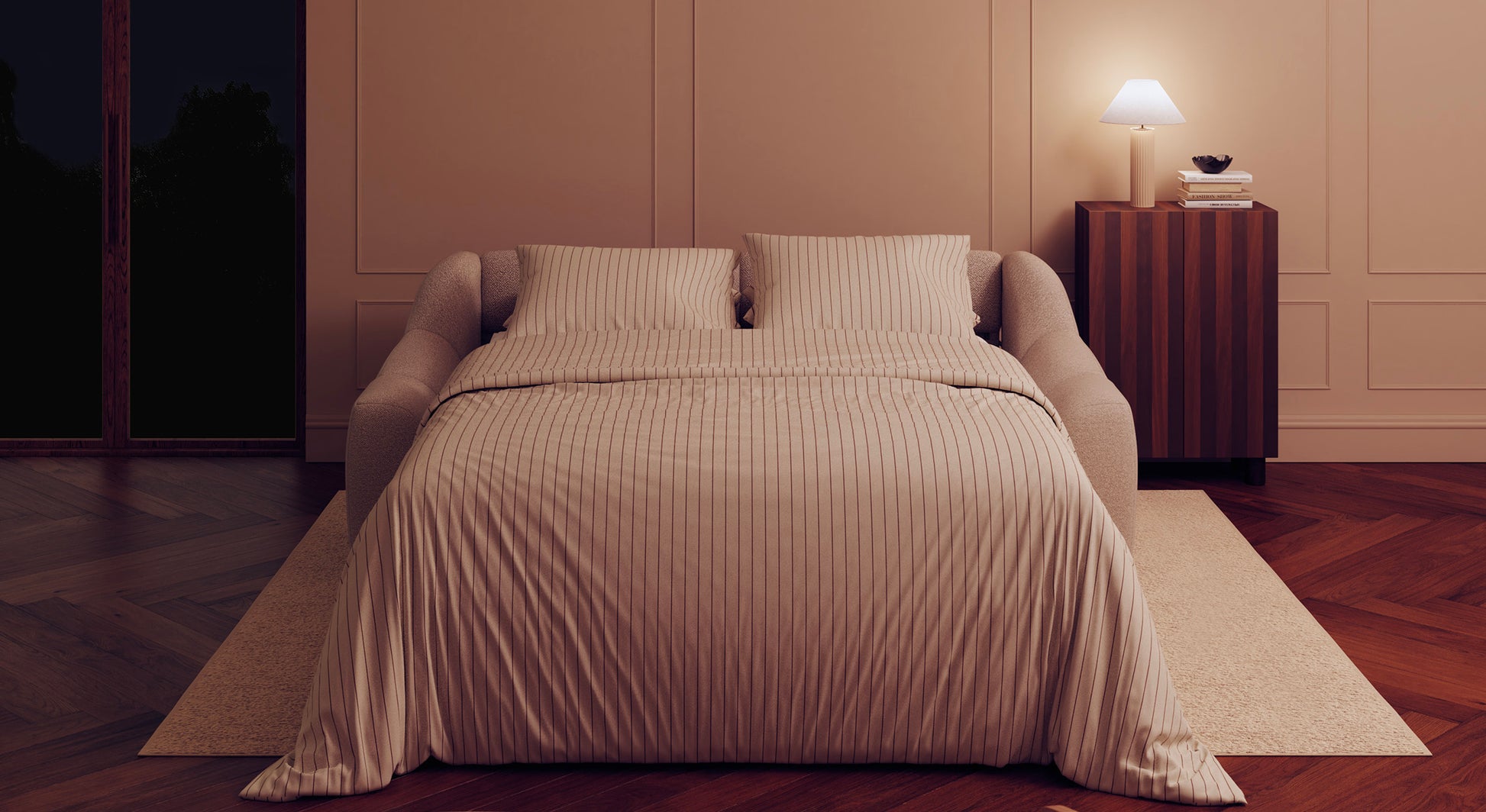 Choose the MAMA set with its convertible sofa and ottoman, a stylish and cozy set that stands out with its reassuring shapes and gentle curves. With its 17cm-thick mattress, it provides a cloud of comfort every day for nights filled with tenderness.