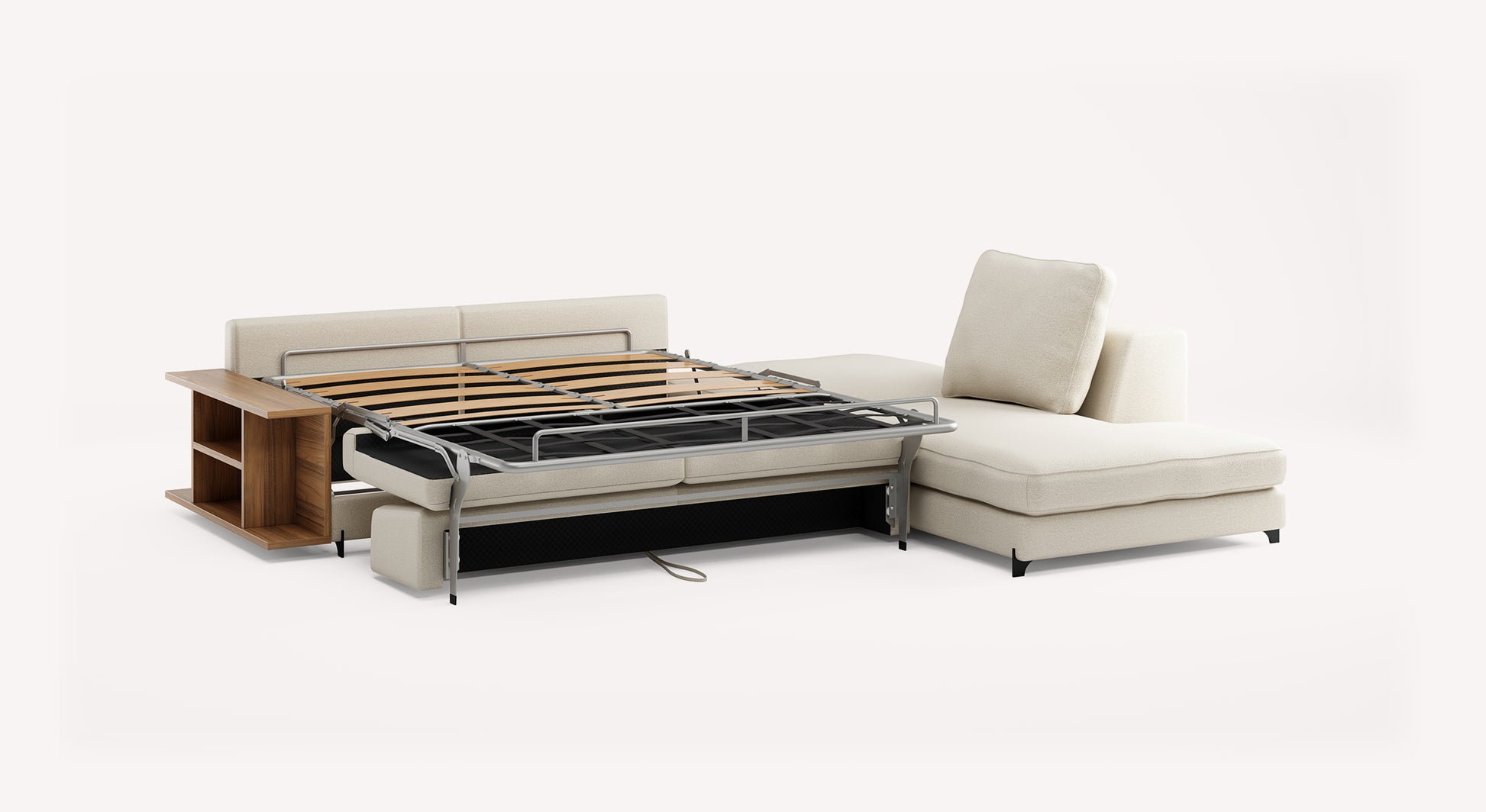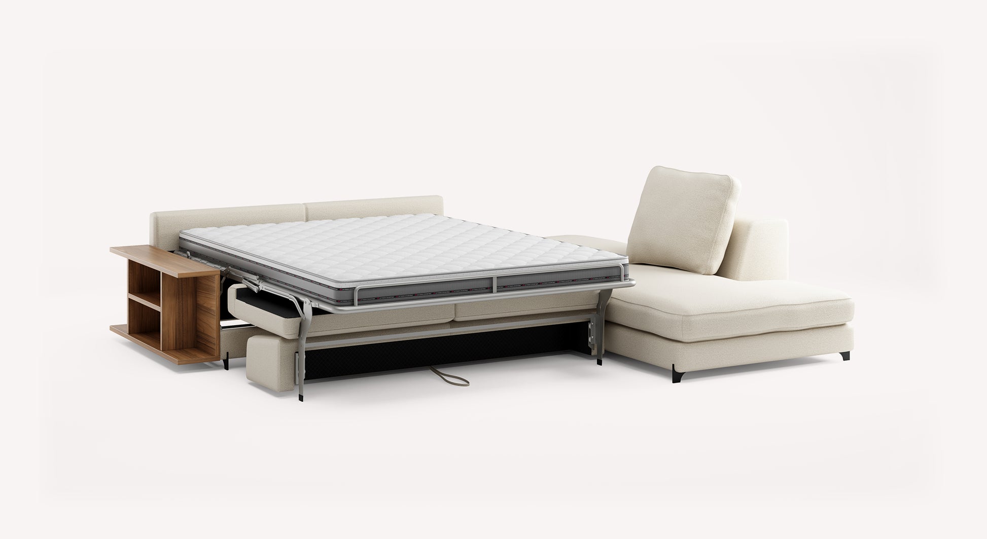 In a few seconds, thanks to the rapido system, it transforms into a real bed composed of a 13 cm thick mattress and a slatted or grid base depending on your preferences. Able to serve as both a comfortable sofa and a bed, it is the ideal multi-use sofa. Our in-store advisors will be delighted to present to you all the possible configurations as well as all the mattresses that will best suit your comfort.