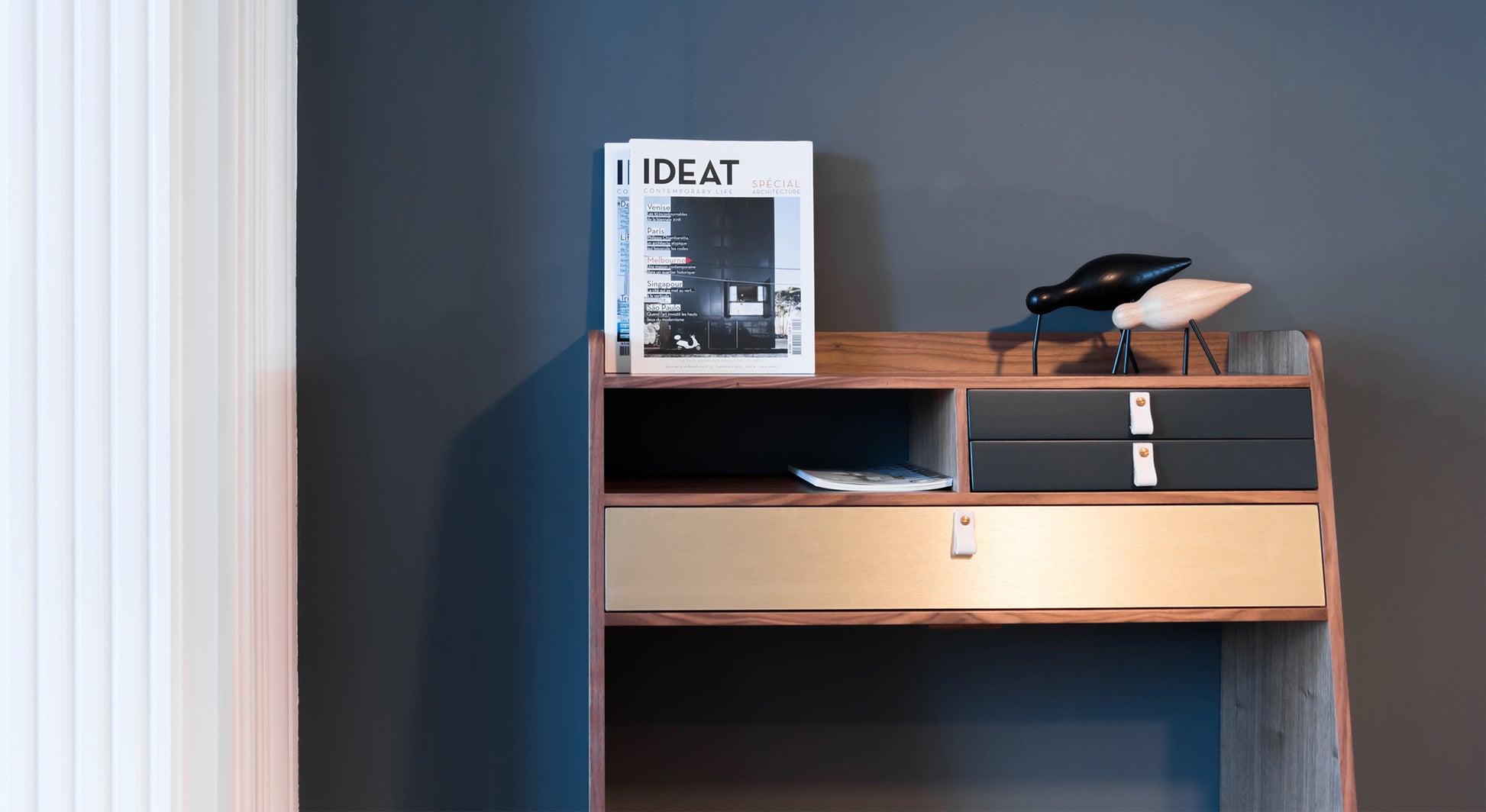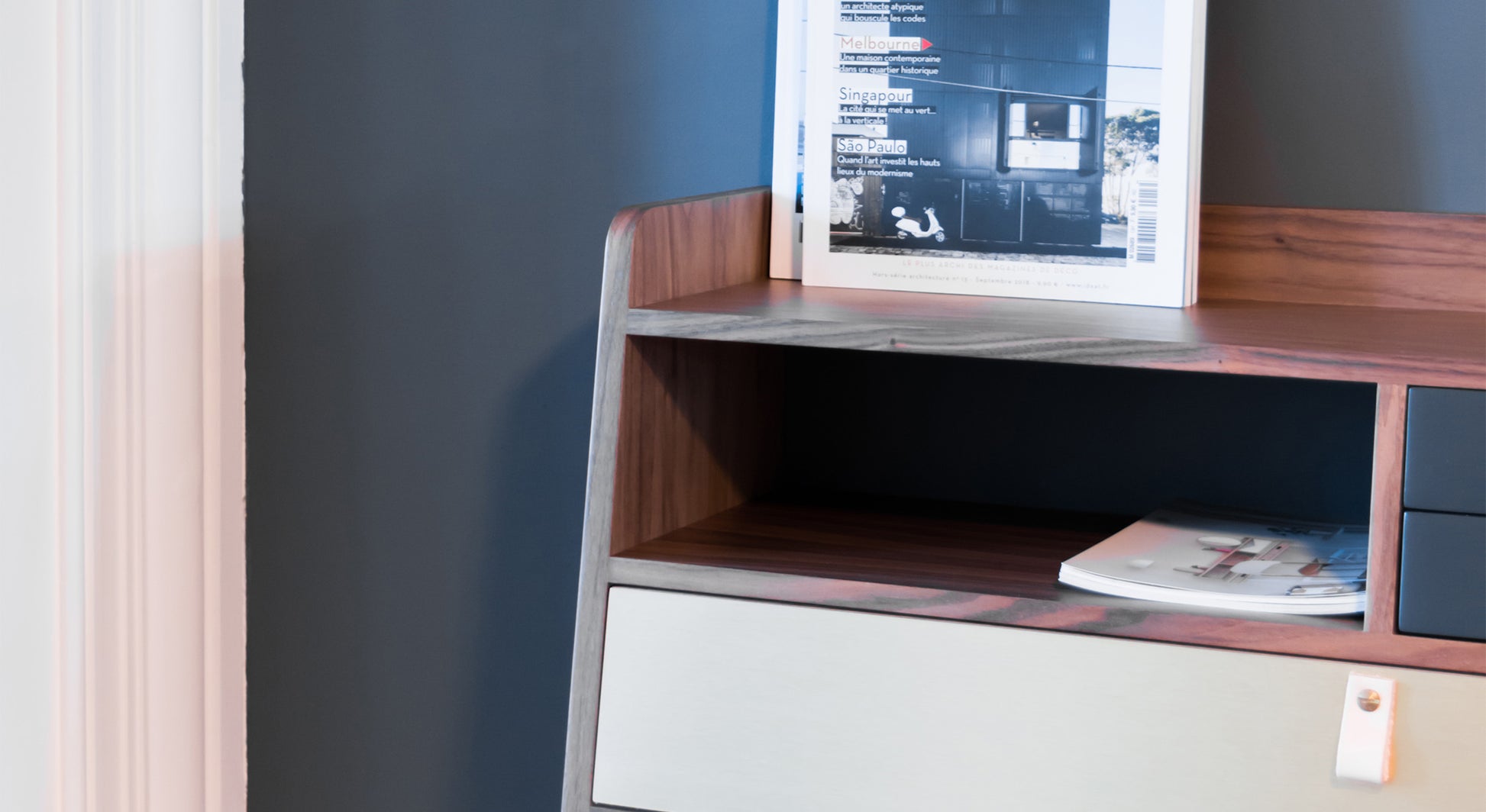 Discover the GASTON wall secretary in Oak or Walnut version. Decorative, practical and discreet, its modern and retro design will bring a touch of originality to your room. Its graphic shapes undoubtedly give more character to any interior.