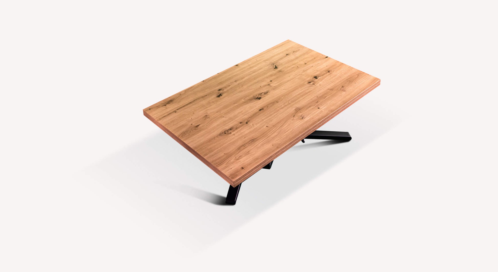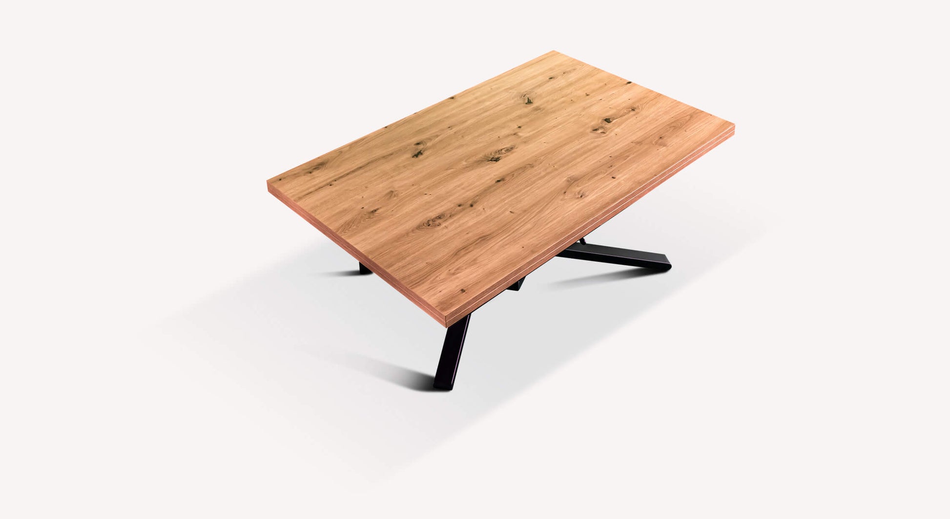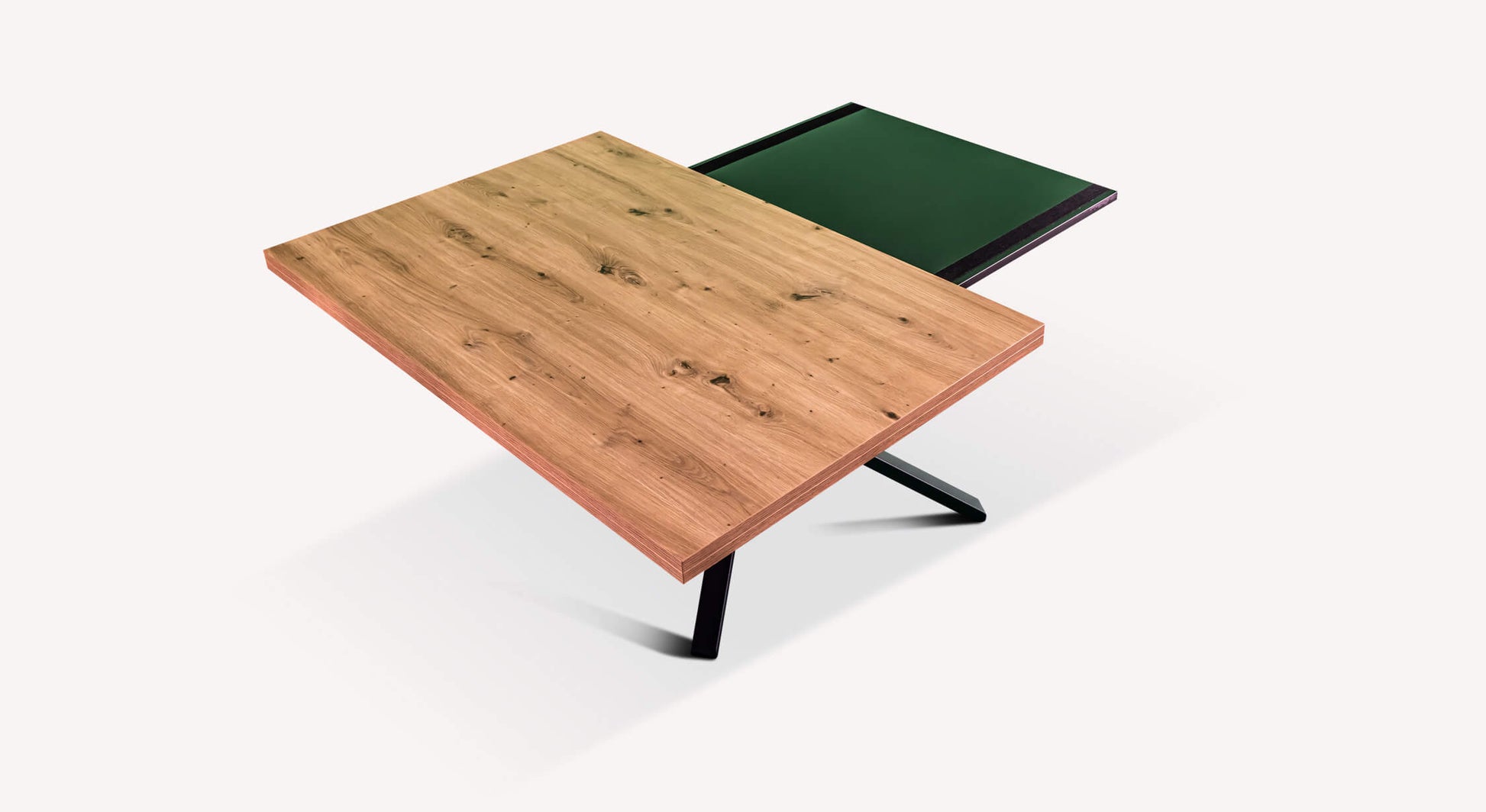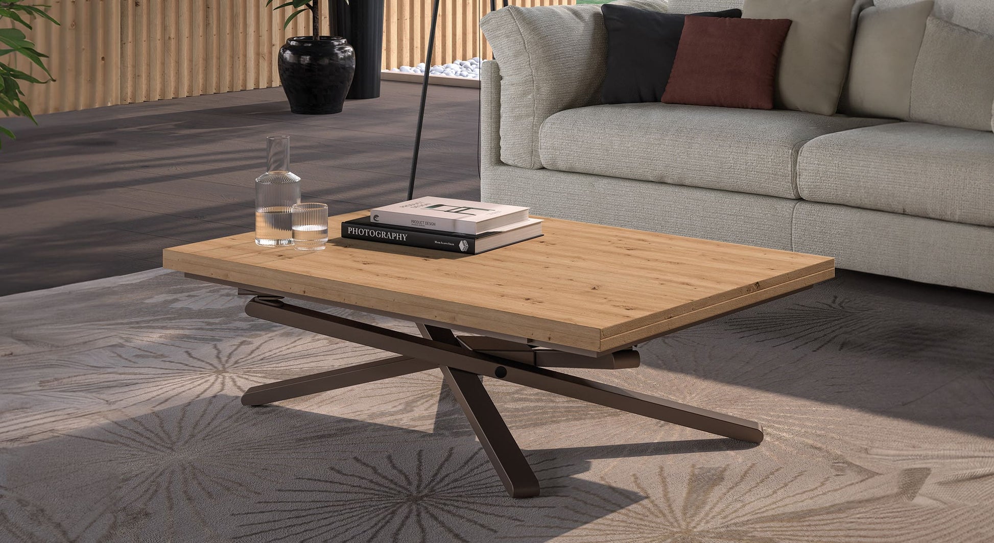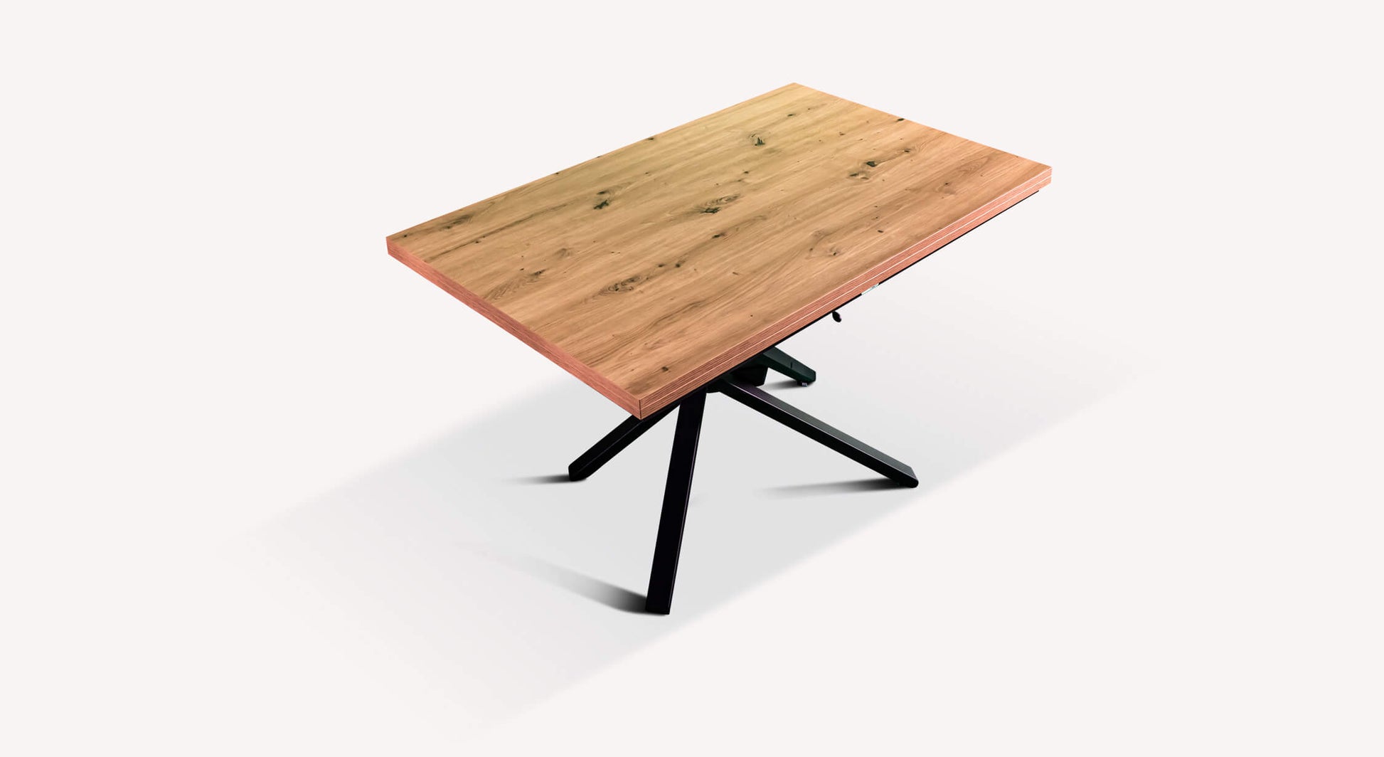 La table relevable SHAZAM est contemporaine et moderne. Elle est aussi un atout gain de place et design avec ses matières raffinées et de qualité supérieure.