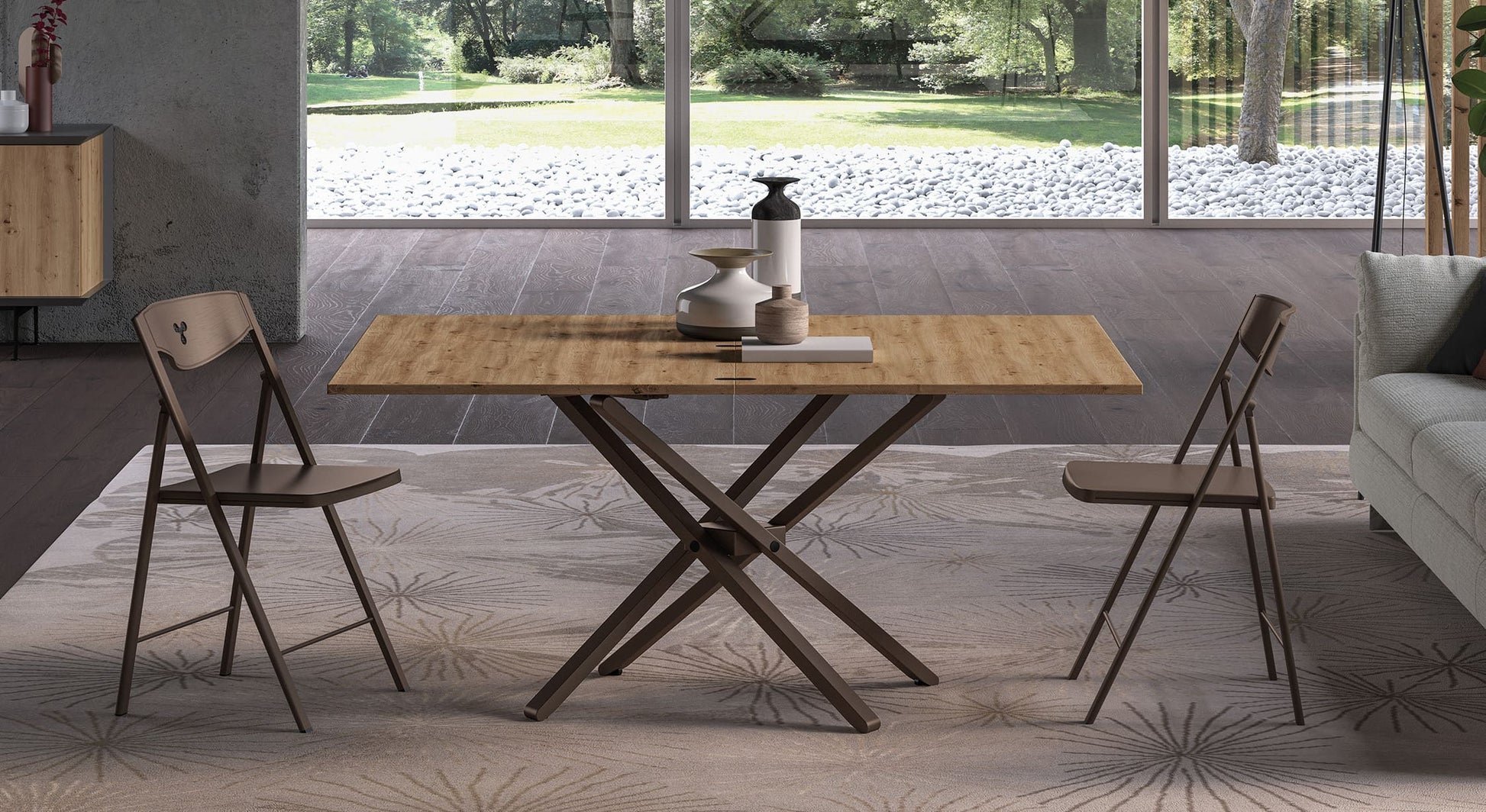 La table à manger SHAZAM relevable et pliable avec ses pieds en métal, ses finitions en bois pourra s'adapter à vos besoins. Elle est parfaite pour les dîners intimes ou les apéritifs entre amis.